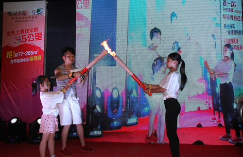 一段動(dòng)力活潑的健身舞拉開了活動(dòng)的序幕,身材火辣的機(jī)車寶貝秀更是將活動(dòng)一次次帶向高潮!代表著廣州總部的小小火炬手出現(xiàn)了,手握著從廣州傳遞的火炬緩緩地走向舞臺(tái)點(diǎn)燃“梅州”,宣布“奧”運(yùn)會(huì)梅州站正式啟幕