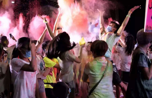 活動(dòng)還沒開始,領(lǐng)到裝備的市民就忍不住嗨起來了!涂涂~抹抹~拿上彩粉噴噴身邊的小伙伴,認(rèn)識(shí)的、不認(rèn)識(shí)的都樂成一團(tuán),然后拍照發(fā)朋友圈,很快項(xiàng)目前廣場就已經(jīng)“遮天蔽日”了,四周都是歡呼聲,嬉笑聲,音樂聲,尖叫聲……被各種聲音淹沒的小奧,站在旁邊看著就覺得手腳不自覺想跳舞。放眼望去全是彩色噠,你們是掉進(jìn)染缸了還是撞見彩虹了?