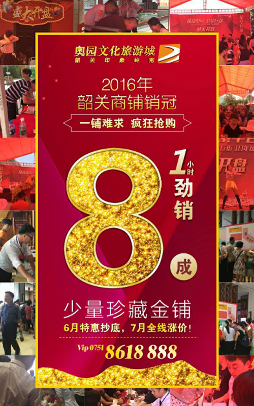 (2016年6月25日——韶關)韶關這個夏天很“熱”,其中最熱的莫過于韶關奧園文化旅游城。6月25日,萬眾期待的商業(yè)街金鋪在這個火熱的夏天盛大開盤, 首期商業(yè)開盤僅1小時內(nèi)所推商鋪就勁銷8成,該盛況讓客戶驚嘆、讓業(yè)界側(cè)目,讓許多未出手的客戶惋惜!韶關奧園文化旅游城,韶關首創(chuàng)第五代室外商業(yè)步行街,奧園商管公司統(tǒng)一經(jīng)營,10年70%超高回報,讓商業(yè)開盤首日火爆搶購、一鋪難求,當之無愧2016年韶關商業(yè)銷售冠軍。