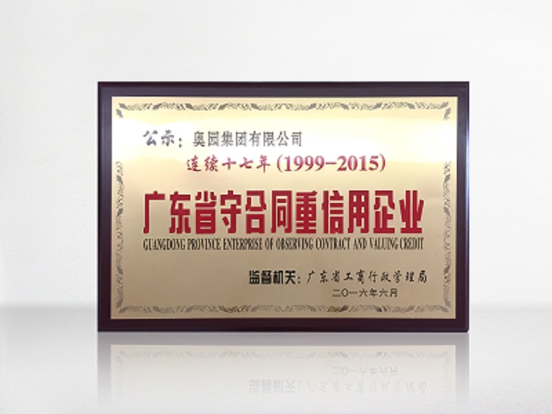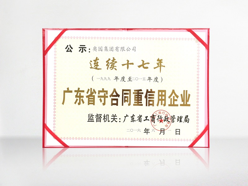 (2016年8月1日——廣州)日前,奧園再次榮獲由廣州市工商行政管理局、廣州企業(yè)信用促進(jìn)會評定頒發(fā)的“廣東省守合同重信用企業(yè)”榮譽(yù)稱號,這是奧園連續(xù)十七年(1999-2015年度)獲此殊榮。