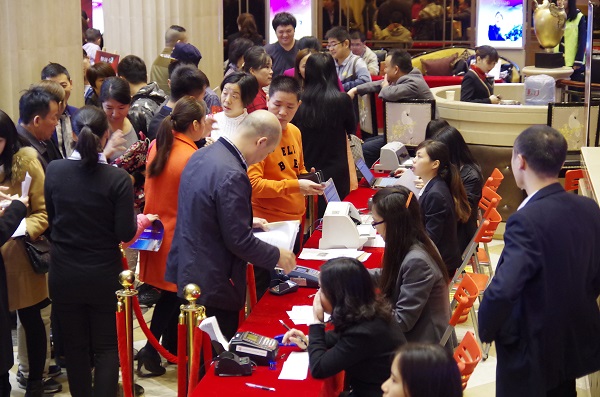 當天9點整,搶房大戰(zhàn)正式拉開序幕。大屏幕不斷滾動著幸運中簽號碼,中簽客戶都一臉欣喜三步并兩步地進入選房區(qū),害怕慢一步就選不到心儀的房子。從選房區(qū)出來的客戶興奮地連喊幸運,并驚嘆現(xiàn)場買房的人數(shù)之多和下手之快。在選房流程中,奧園•公園一號通過加快搖號頻率、嚴控客戶猶豫時間、折扣優(yōu)惠等方式,實現(xiàn)客戶快速選房、當天簽約并加速回款。整個開盤現(xiàn)場議論聲、叫號聲、鑼鼓聲此起彼伏,客戶搶房熱情不斷升溫。