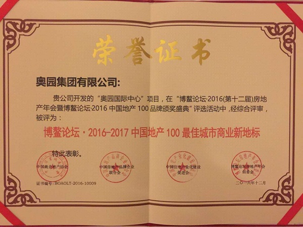 (2016年12月26日——海南)12月26日,為期四天的“博鰲論壇•2016(第十二屆)房地產(chǎn)年會(huì)暨博鰲論壇•2016中國(guó)地產(chǎn)100品牌頒獎(jiǎng)盛典”在海南盛大啟幕,【奧園國(guó)際中心】在27日會(huì)上榮獲“2016-2017中國(guó)地產(chǎn)100最佳城市商業(yè)新地標(biāo)”獎(jiǎng)項(xiàng)。