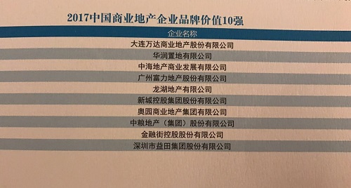 奧園商業(yè)地產(chǎn)集團(tuán)榮膺“2017中國(guó)商業(yè)地產(chǎn)企業(yè)品牌價(jià)值10強(qiáng)”