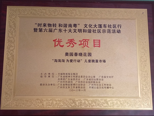 (2018年1月23日——廣州)由羊城晚報(bào)報(bào)業(yè)集團(tuán)發(fā)起,廣東省物業(yè)管理行業(yè)協(xié)會(huì)、廣州市社會(huì)工作協(xié)會(huì)、廣州市義務(wù)工作者聯(lián)合會(huì)聯(lián)合主辦的2017年“時(shí)來(lái)物轉(zhuǎn) 和諧南粵”文化大篷車社區(qū)行暨第六屆廣東十大文明和諧社區(qū)示范活動(dòng)于近日舉行揭曉禮。會(huì)上,奧園春曉花園以成功舉辦“淘淘淘為愛(ài)行動(dòng)”兒童跳蚤市場(chǎng)活動(dòng)斬獲廣東十大文明和諧社區(qū)示范活動(dòng)“優(yōu)秀項(xiàng)目獎(jiǎng)”。