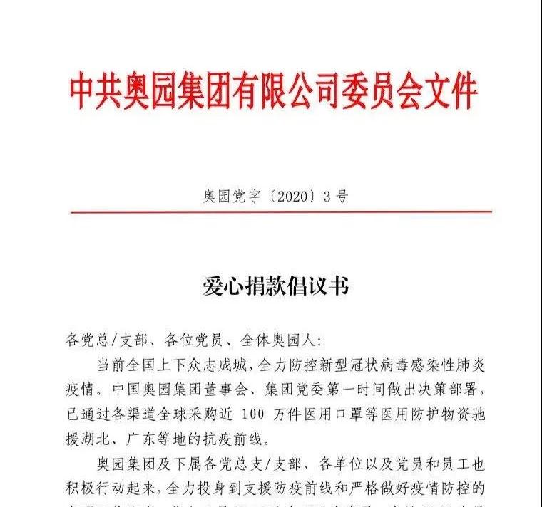 奧園集團(tuán)黨委在2月17日發(fā)布《愛(ài)心捐款倡議書(shū)》