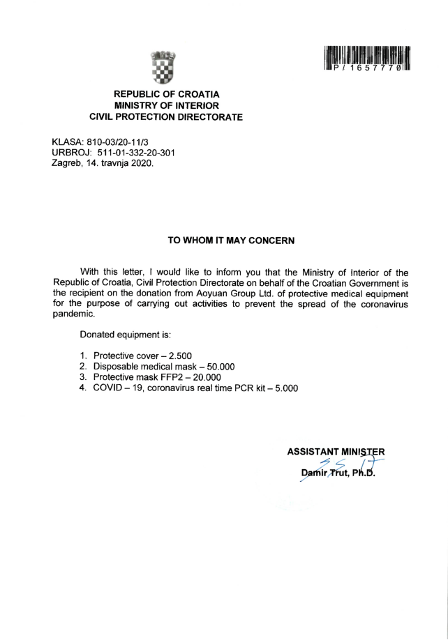 “本人謹(jǐn)以此信通知貴司,克羅地亞內(nèi)政部民防局將代表克羅地亞政府盡數(shù)接收奧園集團(tuán)的慷慨捐贈(zèng),物資將用于開(kāi)展預(yù)防新冠病毒大流行的相關(guān)活動(dòng)。”在克羅地亞共和國(guó)內(nèi)政部民防局發(fā)出的接收函中,部長(zhǎng)助理達(dá)米爾·儲(chǔ)特博士表示。