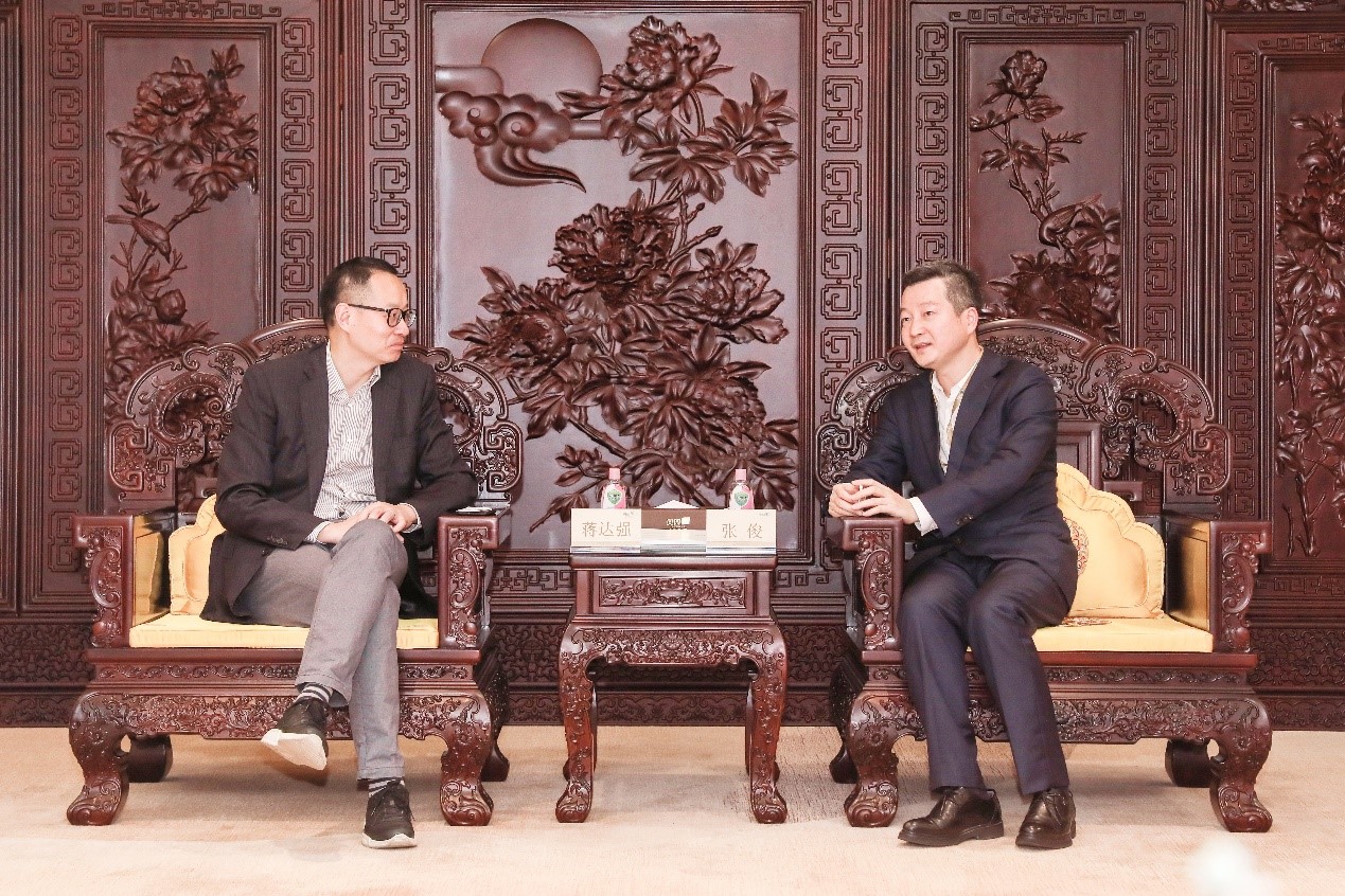 中國奧園集團執(zhí)行董事、高級副總裁張?。ㄓ遥┡c弘陽集團總裁蔣達強(左)座談交流