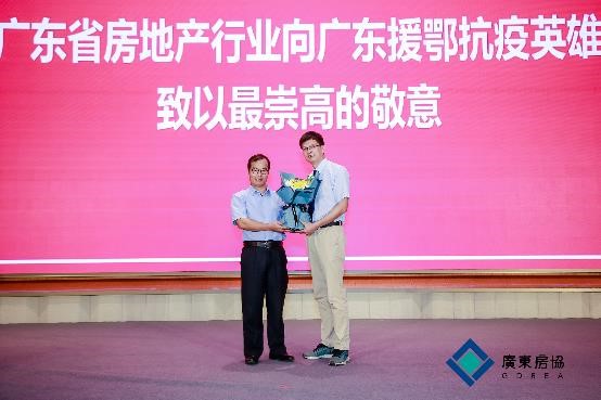 廣東省房地產(chǎn)協(xié)會會長王韶(左)向廣東省中醫(yī)院援鄂醫(yī)療隊(duì)員、芳村醫(yī)院重癥醫(yī)學(xué)科副主任醫(yī)師謝東平(右)獻(xiàn)花
