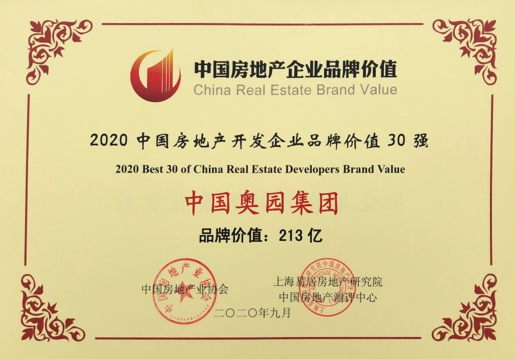 9月17日,由中國(guó)房地產(chǎn)業(yè)協(xié)會(huì)、上海易居房地產(chǎn)研究院中國(guó)房地產(chǎn)測(cè)評(píng)中心聯(lián)合主辦的“2020中國(guó)房地產(chǎn)企業(yè)品牌價(jià)值測(cè)評(píng)成果發(fā)布會(huì)暨房地產(chǎn)品牌發(fā)展高峰論壇”在上海舉行,中國(guó)奧園集團(tuán)榮膺“2020中國(guó)房地產(chǎn)開發(fā)企業(yè)品牌價(jià)值30強(qiáng)”“2020中國(guó)商業(yè)地產(chǎn)企業(yè)品牌價(jià)值10強(qiáng)”。