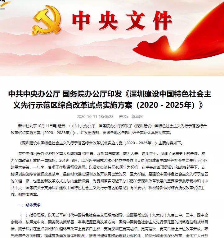 10月11日,中共中央辦公廳、國(guó)務(wù)院辦公廳印發(fā)了《深圳建設(shè)中國(guó)特色社會(huì)主義先行示范區(qū)綜合改革試點(diǎn)實(shí)施方案(2020-2025年)》(下稱《方案》),賦予深圳在重點(diǎn)領(lǐng)域和關(guān)鍵環(huán)節(jié)改革上更多自主權(quán),有力推進(jìn)深圳的改革開(kāi)放事業(yè)。