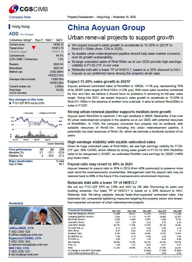 于2020年6月底,奧園擁有逾50個(gè)不同階段的城市更新項(xiàng)目,預(yù)計(jì)額外貢獻(xiàn)可售資源約人民幣6,587億元。銀河-聯(lián)昌證券等認(rèn)為,奧園舊改資源豐富,隨著轉(zhuǎn)化加速,將為中長(zhǎng)期業(yè)績(jī)?cè)鲩L(zhǎng)提供動(dòng)力。