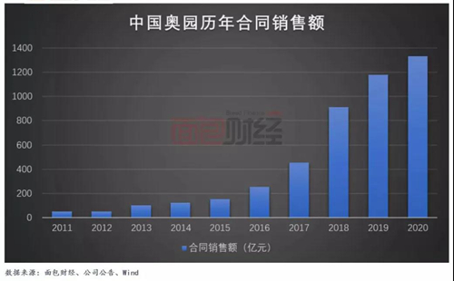 2020年,盡管有疫情的影響,中國奧園再次實現(xiàn)合同銷售額創(chuàng)下歷史新高,達(dá)到1330.1億元,同比增長13%。對比來看,2020年國內(nèi)商品房銷售額約為17.36萬億元,同比增長8.7%。由此可見,中國奧園2020年合同銷售額的增速明顯快于行業(yè)整體增速。