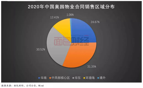 經(jīng)過持續(xù)的積累,中國奧園目前已完成全國化布局。在公司2020年物業(yè)合同銷售區(qū)域分布中,華南、中西部核心區(qū)、華東的銷售額分別為328.10億元、417.00億元、405.90億元,分別占比24.67%、31.35%和30.52%,整體分布較為均勻,有助于提升公司抗風(fēng)險能力。