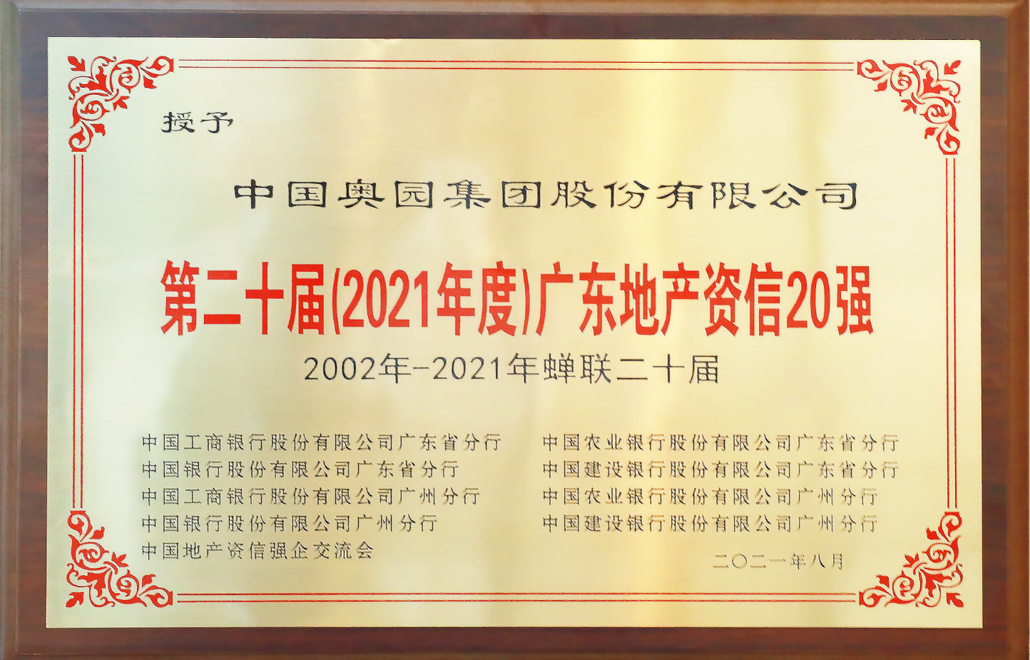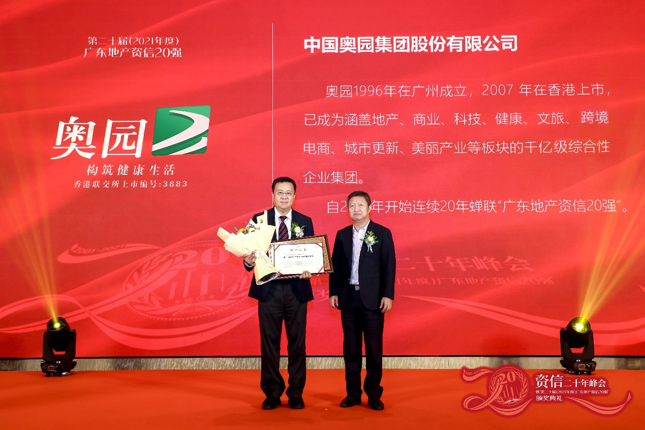 中國(guó)奧園獲評(píng)“第二十屆(2021年度)廣東地產(chǎn)資信20強(qiáng)”