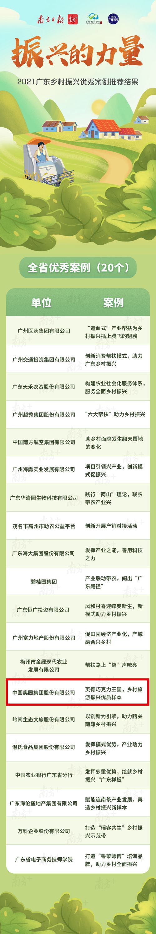 11月25日,由南方報業(yè)傳媒集團主辦的“振興的力量——2021廣東鄉(xiāng)村振興優(yōu)秀案例推介活動”評選結果正式出爐。中國奧園集團旗下文旅項目——奧園英德巧克力王國獲評“廣東鄉(xiāng)村振興優(yōu)秀案例”。