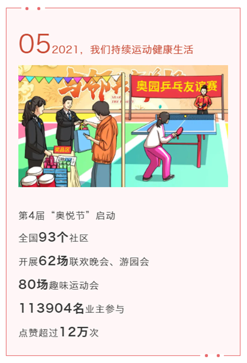 本屆奧悅節(jié)為期3個多月,覆蓋27座城市、93個社區(qū),通過舉辦聯(lián)歡晚會、健康運動會、尊老敬老等活動服務(wù)業(yè)主,用實際行動兌現(xiàn)“構(gòu)筑健康生活”的品牌理念。