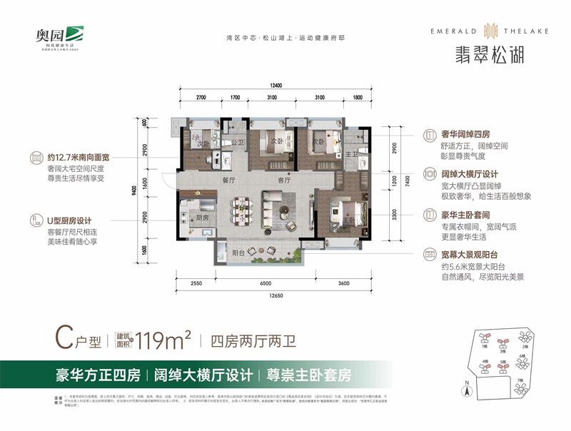為滿足客戶暢享全景四季鮮氧生活需求,翡翠松湖在戶型上極力打造寬幕尺度。其中,建面119㎡的4房2廳2衛(wèi),擁有約12.7米南向面寬,約7米寬境大橫廳,讓業(yè)主無論是居家還是接待客人均顯氣派。另外,該戶型約5.6米寬境陽臺與客廳相連貫通,盡享無界景觀視野。太太的瑜伽,孩子的露營帳篷,父母的花草,生活點滴輕松容納。