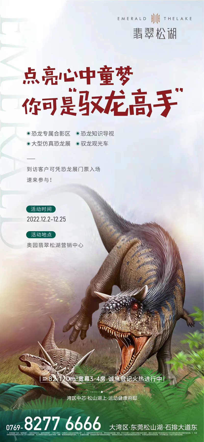 目前,翡翠松湖項目正誠意登記中。12月2日至25日到訪,還可以現(xiàn)場參觀大型“奇幻恐龍展,探秘侏羅紀(jì)”展覽。期間,現(xiàn)場還會設(shè)置專屬科普知識,更有激萌恐龍拍照打卡點,體驗與龍仔一起破殼而出,期待與您共鑒神秘奇遇。