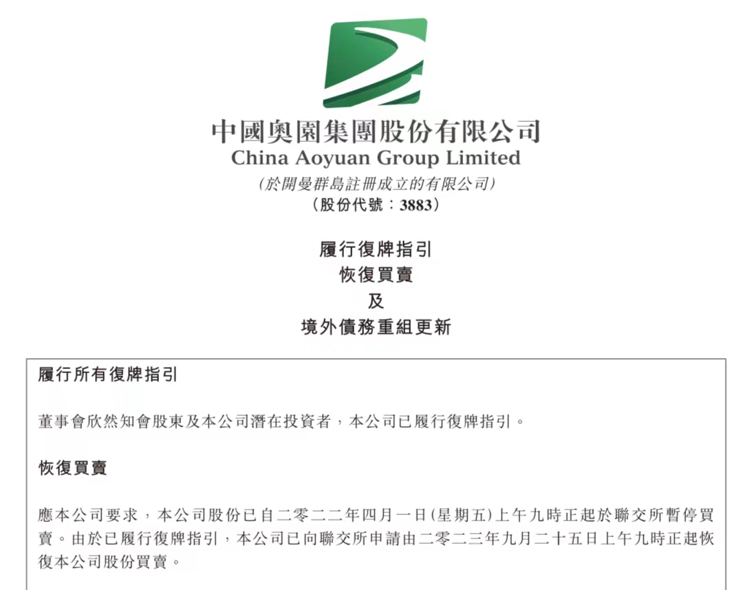 9月22日晚,中國奧園集團(tuán)(03883.HK)發(fā)布公告,已完成全部復(fù)牌指引相關(guān)工作,將于9月25日上午9時(shí)起正式在香港聯(lián)交所恢復(fù)股票交易。