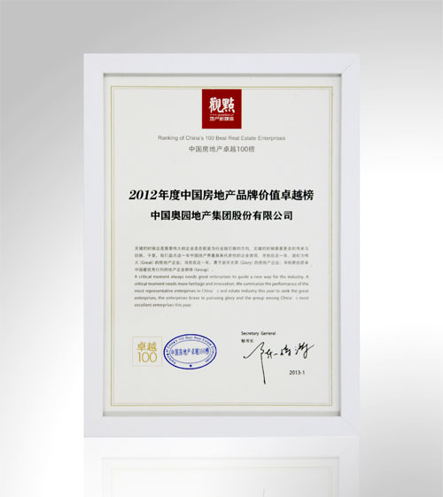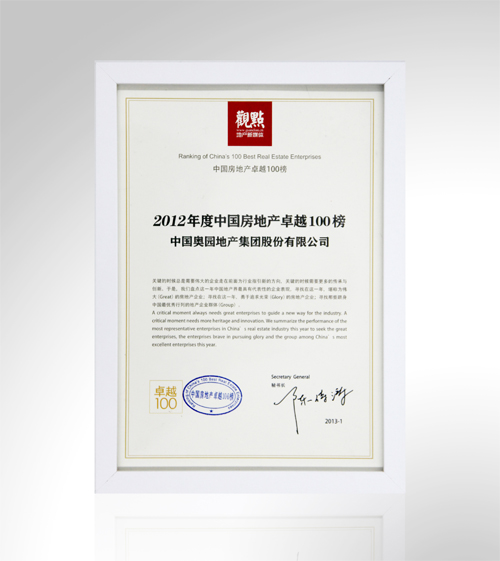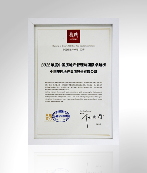 (2013年1月9日——廣州)在廣州舉行的“城市觀點論壇中國行2012年度論壇”中,觀點地產(chǎn)新媒體發(fā)布“2012年度中國房地產(chǎn)卓越100榜”,中國奧園地產(chǎn)集團榮獲“2012年度中國房地產(chǎn)卓越100榜”、“2012年度中國房地產(chǎn)品牌價值卓越榜”、“2012年度中國房地產(chǎn)管理與團隊卓越榜”三項大獎。