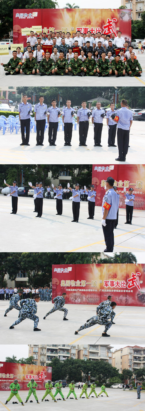 (2012年7月31日——廣州)為進(jìn)一步提升物業(yè)安全管理服務(wù)品質(zhì),奧園物業(yè)在金奧項(xiàng)目運(yùn)動(dòng)城前廣場(chǎng)舉辦“奧園物業(yè)第一屆軍事大比武”活動(dòng)。本次比賽是奧園物業(yè)第一次圍繞“八一”建軍節(jié)主題舉辦的大型活動(dòng),旨在提高公司安全管理團(tuán)隊(duì)的服務(wù)品質(zhì),提高秩序維護(hù)員的個(gè)人軍事技能,為團(tuán)隊(duì)建設(shè)及安全維護(hù)管理打下扎實(shí)的基礎(chǔ),同時(shí)考核參賽隊(duì)伍的指揮協(xié)調(diào)能力,鍛鑄團(tuán)隊(duì)精神。