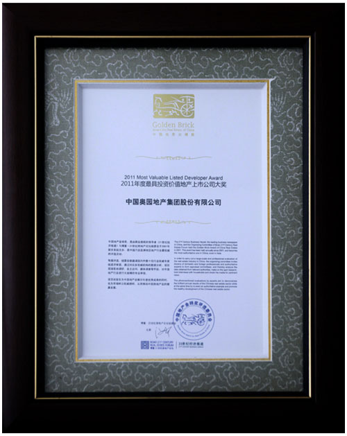 中國奧園地產(chǎn)集團榮獲第11屆中國地產(chǎn)金磚獎之最具投資價值地產(chǎn)上市公司獎