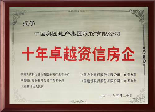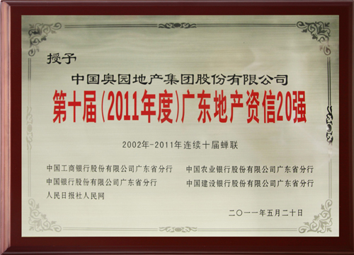 在5月20日廣州舉行的“和諧·共贏·發(fā)展”地產(chǎn)金融峰會(huì)暨“第十屆(2011年度)廣東地產(chǎn)資信20強(qiáng)”頒獎(jiǎng)典禮上,奧園一舉摘得“廣東地產(chǎn)資信20強(qiáng)”和“十年卓越資信房企”兩項(xiàng)殊榮。該榮譽(yù)由中國(guó)工商銀行等四大國(guó)有商業(yè)銀行廣東省分行聯(lián)合中央權(quán)威媒體綜合評(píng)定,共同頒發(fā)。
