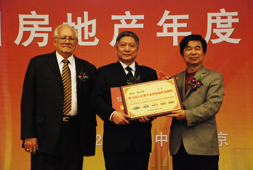 (2010年12月11日——沈陽)聯(lián)合國人居署全球最佳范例專家委員會副主任委員、北卡羅萊納大學(xué)政府管理學(xué)院經(jīng)濟(jì)學(xué)博士愛德華·思格魯格斯教授、聯(lián)合國工業(yè)發(fā)展組織中國投資于技術(shù)促進(jìn)處綠色產(chǎn)業(yè)專家委員會委員、中國生態(tài)經(jīng)濟(jì)學(xué)會副會長、國務(wù)院突出貢獻(xiàn)津貼專家王松霈先生、中國房地產(chǎn)總評榜組委會秘書長王棟先生一行駛來到沈陽奧園·國際城,他們代表聯(lián)合國人居署全球最佳范例專家委員會和中國地產(chǎn)總評榜組委會向奧園·國際城頒發(fā)“聯(lián)合國人居署生態(tài)科技最佳范例獎”,奧園·國際城總經(jīng)理陶力群先生代表奧園接受兩位專家頒發(fā)的“聯(lián)合國人居署生態(tài)科技最佳范例獎”獎牌。
