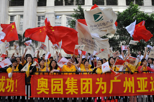 上午11時(shí),火炬手郭梓寧副主席出現(xiàn)在濱江東路段傳遞現(xiàn)場(chǎng),奧園人忘記了初冬的寒冷和疲倦,大家熱情洋溢,揮旗鼓舞。當(dāng)前一名火炬手點(diǎn)燃郭副主席手中的火炬后,現(xiàn)場(chǎng)頓時(shí)一片歡騰,在四名亞運(yùn)會(huì)火炬護(hù)衛(wèi)的引導(dǎo)下,郭副主席自信地微笑著,一邊向前小跑一邊向市民揮手致敬,雖然只是短短100米的路程,但從他整齊的步伐里,我們看到了認(rèn)真與嚴(yán)謹(jǐn),看到了作為奧園人的驕傲與自豪!兩旁的奧園員工齊齊吶喊“廣州加油!亞運(yùn)加油!奧園加油!”,嘹亮的吶喊聲帶動(dòng)了現(xiàn)場(chǎng)幾萬名駐足觀看市民的歡呼喝彩,共同將氣氛推向高潮,火炬所到之處,歡呼聲和掌聲連綿不斷,體現(xiàn)了廣大市民對(duì)亞運(yùn)圣火的熱切期盼。