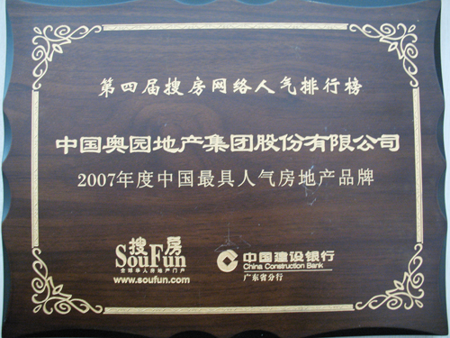中國(guó)奧園地產(chǎn)集團(tuán)榮獲“2007年度中國(guó)最具人氣房地產(chǎn)品牌”稱號(hào)