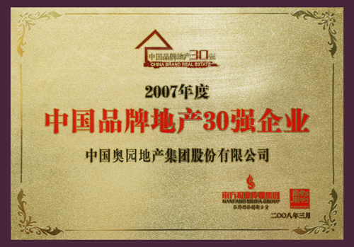 (2008年3月——廣州)中國奧園地產集團股份有限公司(香港股票代號:3883)在由南方報業(yè)傳媒集團主辦、《南都周刊》承辦的首屆“中國品牌地產30強”評選中入選為中國品牌地產30強。