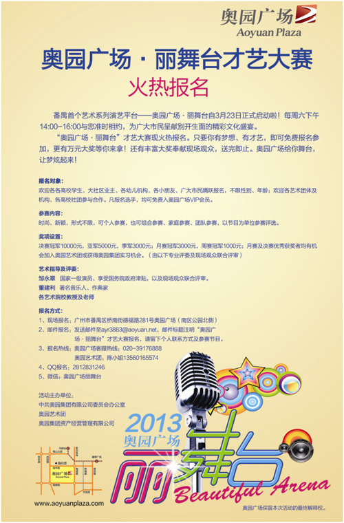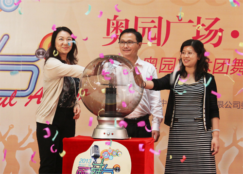 (2013年3月23日——廣州)由奧園集團(tuán)、奧園藝術(shù)團(tuán)、奧園廣場聯(lián)合打造的番禺區(qū)首個大眾藝術(shù)系列演藝平臺——奧園廣場·麗舞臺盛大啟幕,奧園藝術(shù)團(tuán)演藝招募暨才藝大賽火熱報名同步啟動,為番禺市民奉獻(xiàn)一場別開生面的精彩文化盛宴和展示才藝的精彩舞臺。奧園集團(tuán)行政總裁郭梓寧先生、行政中心總監(jiān)楊蓓女士等共同啟動了“奧園廣場·麗舞臺”啟幕儀式。