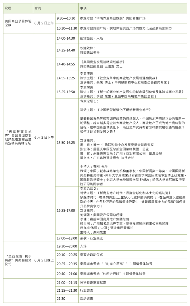 奧園集團專注于住宅和商業(yè)地產的雙線開發(fā),作為國內商業(yè)地產開發(fā)的后來者,在奧園近年開發(fā)的項目中,無論是奧園廣場的“O-STYLE”理念,還是沈陽奧園會展廣場和會展經濟的融合,以及奧園城市天地對休閑、娛樂、文化等元素的整合,處處彰顯出奧園商業(yè)品牌的獨特理念。奧園集團將在此次峰會上發(fā)布集團商業(yè)地產發(fā)展戰(zhàn)略,此外,作為奧園優(yōu)秀商家資源庫的載體——奧商會也將在此次活動中盛大啟動。