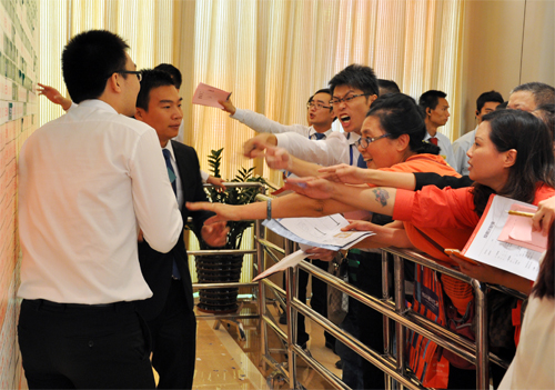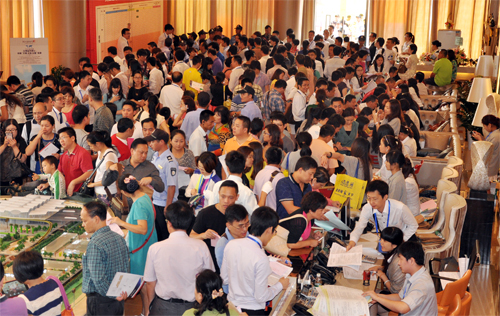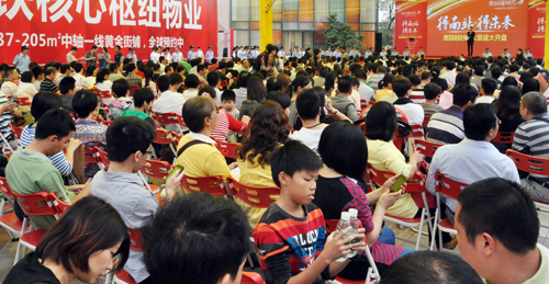 當(dāng)天早上7點(diǎn),南站地區(qū)車流猶如長(zhǎng)龍,項(xiàng)目周邊道路排滿私家車等候進(jìn)入臨時(shí)停車場(chǎng)。8點(diǎn)鐘,距離開(kāi)盤(pán)還有一個(gè)小時(shí),現(xiàn)場(chǎng)等候區(qū)早已人山人海,上千名客戶手里緊緊地拿著搖簽號(hào)。經(jīng)統(tǒng)計(jì),當(dāng)天近兩千名客戶到場(chǎng),掀起了一場(chǎng)樞紐商業(yè)物業(yè)搶奪大戰(zhàn)。