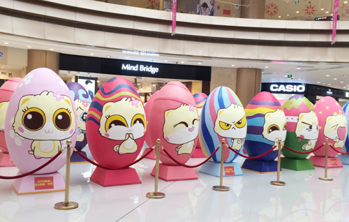 當(dāng)天除了是奧園廣場“喵星星”兒童主題商城開業(yè)的吉日,也是西方復(fù)活節(jié)。奧園廣場為這個(gè)特殊的日子量身設(shè)計(jì)了58顆大彩蛋,彩蛋上惟妙惟肖地畫上了表情各異的吉祥物“喵星人”形象,呆萌形象更讓顧客大呼可愛。