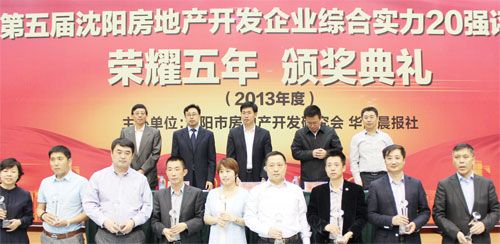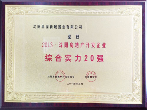 ?。?014年5月16日——沈陽(yáng))沈陽(yáng)奧園在由由沈陽(yáng)房地產(chǎn)開(kāi)發(fā)研究會(huì)、《華商晨報(bào)》共同舉辦的第五屆沈陽(yáng)房地產(chǎn)開(kāi)發(fā)業(yè)綜合實(shí)力20強(qiáng)頒獎(jiǎng)典禮上,被評(píng)定為“2013年度沈陽(yáng)房地產(chǎn)企業(yè)綜合實(shí)力20強(qiáng)”企業(yè)。
