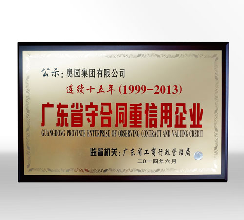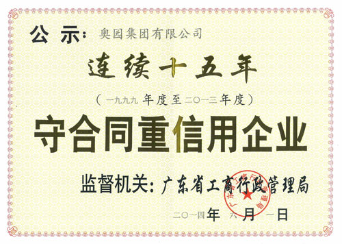 奧團(tuán)集團(tuán)連續(xù)十五年榮獲“廣東省守合同重信用企業(yè)”,充分體現(xiàn)了“高效、誠信、責(zé)任”的企業(yè)精神,體現(xiàn)奧園重視合同管理和履行企業(yè)責(zé)任,不斷提升企業(yè)品牌知名度與美譽(yù)度,受到了政府及社會各界的一致好評和高度認(rèn)可。