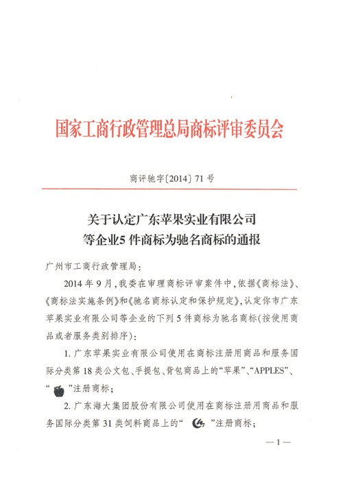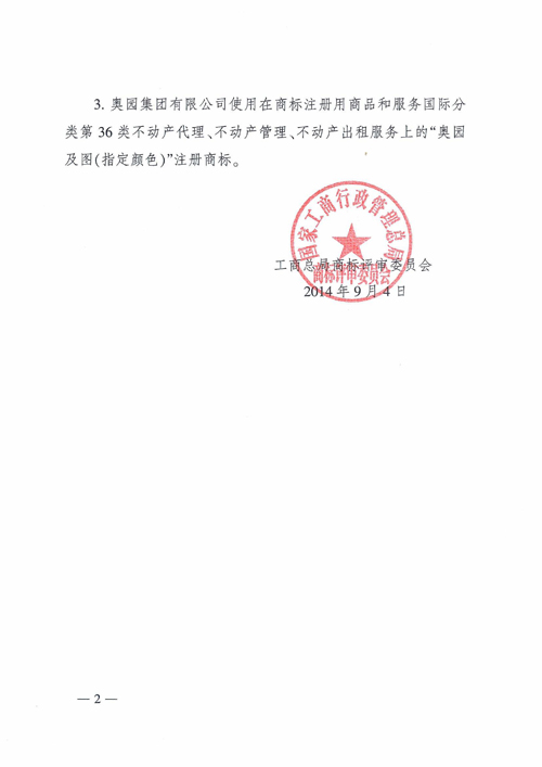 ?。?014年11月19日——廣州)11月16日,國家工商行政管理總局商標評審委員會下發(fā)廣州市工商行政管理局的《關(guān)于認定廣東蘋果實業(yè)有限公司等企業(yè)5件商標為馳名商標的通報》。根據(jù)通報,國家工商行政管理總局商標評審委員會認定奧園集團有限公司使用在商標注冊用商品和服務國際分類第36類不動產(chǎn)代理、不動產(chǎn)管理、不動產(chǎn)出租服務上的“奧園及圖(指定顏色)”注冊商標為“中國馳名商標”。