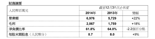 營業(yè)額增長22%至人民幣70億元,凈負債比率降至61.8%,有效去杠桿化
