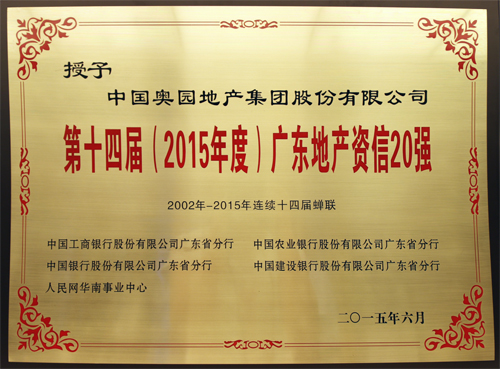“第十四屆(2015年度)廣東地產(chǎn)資信20強”獲獎牌