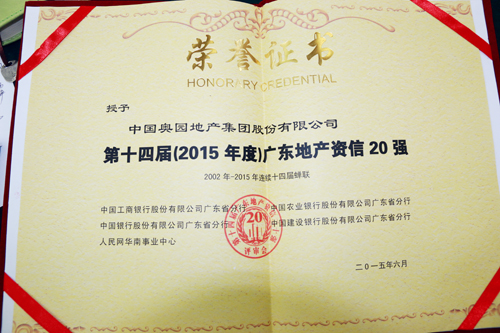 “第十四屆(2015年度)廣東地產(chǎn)資信20強”獎狀