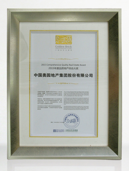 中國奧園榮獲“2015年度品質(zhì)地產(chǎn)綜合大獎(jiǎng)”