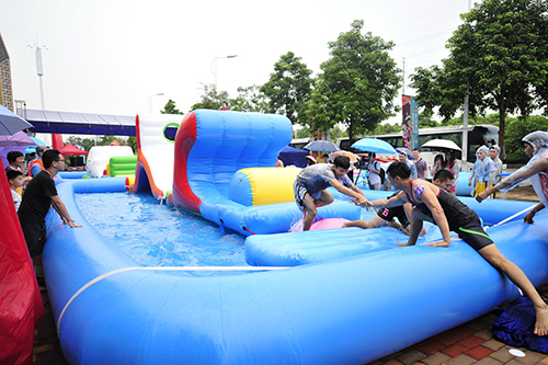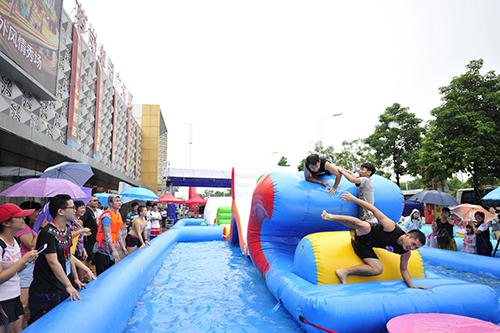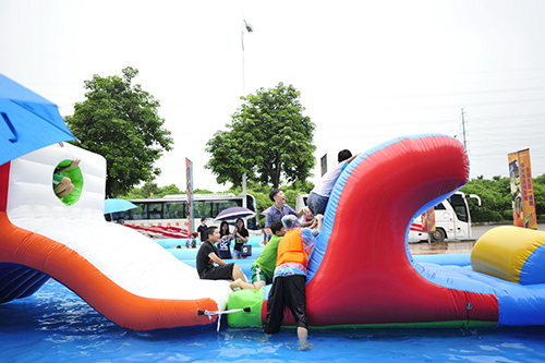 本次“水上繽FUN嘉年華”活動(dòng)中的水上大沖關(guān)環(huán)節(jié)吸引了小到六歲,大到五十多歲各年齡段人群參與,很多都是全家出動(dòng),團(tuán)結(jié)一致完成比賽項(xiàng)目。因?yàn)橄掠暝黾恿怂吓逝离y度,但參賽者們不畏艱難,互相幫助,一次次沖過難關(guān),當(dāng)完成任務(wù)時(shí),已經(jīng)全身濕透,早已分不清是雨水還是汗水,但我們都知道這是一份團(tuán)隊(duì)拼搏的喜悅。