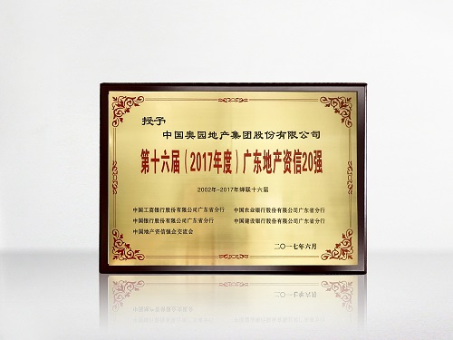 奧園連續(xù)16年蟬聯(lián)“廣東地產(chǎn)資信20強(qiáng)”