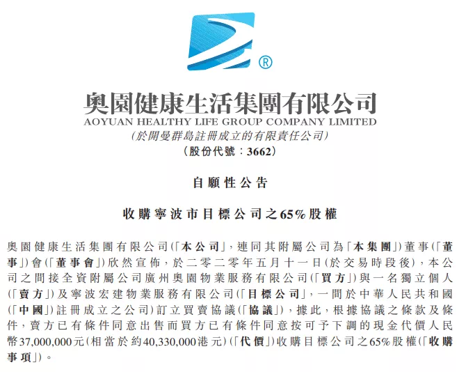 奧園健康收購寧波宏建65%股權(quán) 中國奧園加速完善旗下物管業(yè)務(wù)布局