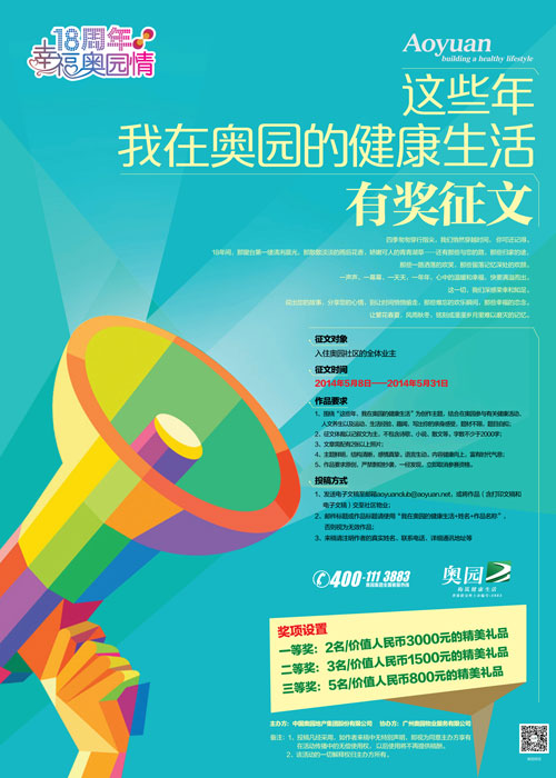 征文活動(dòng)征集時(shí)間為2014年5月8日至5月31日,征文對(duì)象為奧園全體業(yè)主。征文作品要求圍繞“這些年,我在奧園的健康生活”為創(chuàng)作主題,結(jié)合在奧園參與有關(guān)健康活動(dòng)、人文養(yǎng)生及運(yùn)動(dòng)、生活經(jīng)驗(yàn)、趣聞,寫(xiě)出業(yè)主的親身感受,題材不限,題目自擬。征文體裁以記敘文為主,不包含詩(shī)歌、小說(shuō)、散文等。字?jǐn)?shù)不少于2000字。5月31日前,只要是奧園業(yè)主,發(fā)送電子文稿至郵箱aoyuanclub@aoyuan.net,或?qū)⒆髌罚ê蛴∥母搴碗娮游母澹┙恢辽鐓^(qū)物業(yè),都有機(jī)會(huì)獲得3000元的獎(jiǎng)金。大賽終評(píng)結(jié)果將于6月31日之前公布。