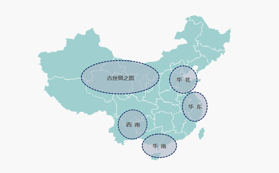 以華南、華東、華北、西南及圍繞古絲綢之路為核心圈布局,未來將向海外拓展。